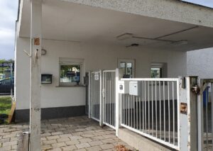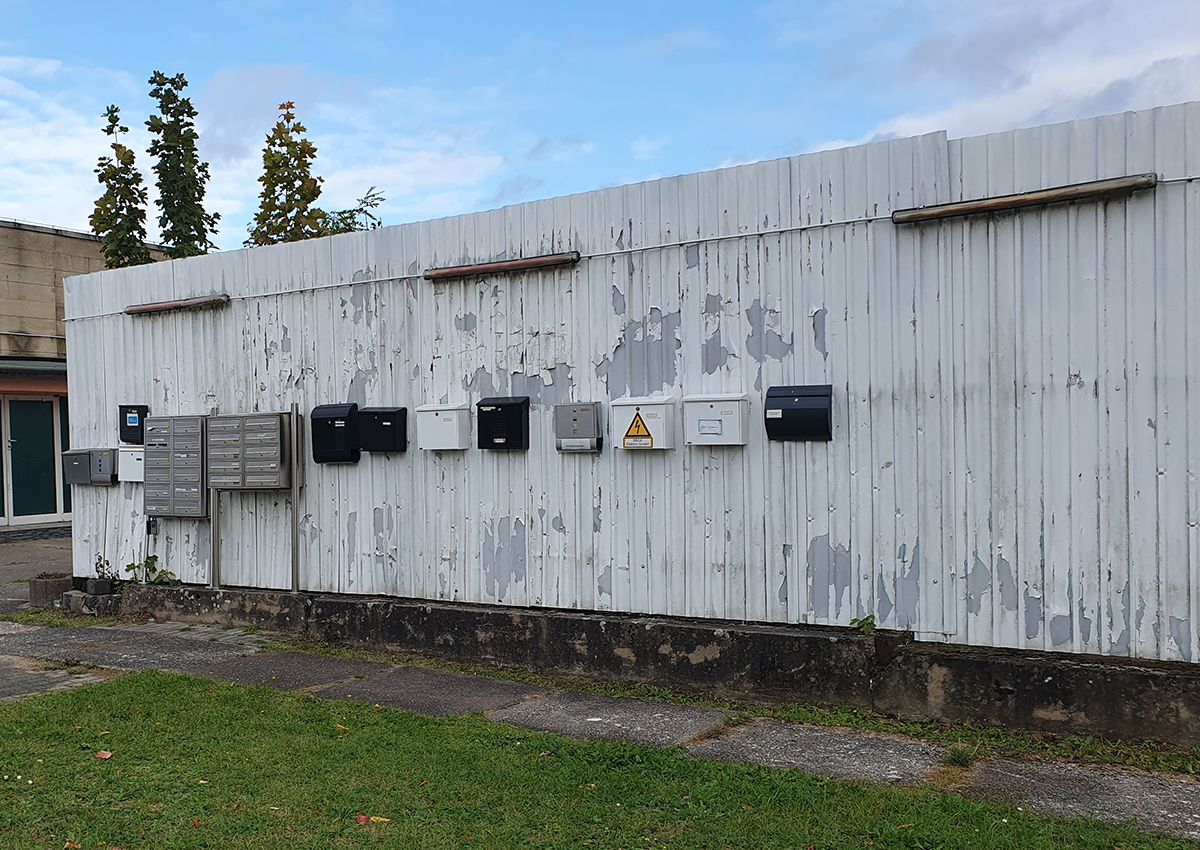 Das erste Ziel ist ein Gewerbegebiet im Osten der großen kreisangehörigen Stadt, wie das 46.000-Einwohner-Städtchen kommunalrechtlich definiert ist. Am Schönfelder Weg, gegenüber einer Grundschule, an der am Sonntag nichts los ist, liegen mehrere Parkplätze, auf denen ebenfalls nichts los ist. Nur vor dem knallorangefarbenen Imbisswagen lassen sich drei Leute entspannt frische Hamburger schmecken. Neben einem der Parkplätze hängen an einer Blechwand 12 einzelne, nicht zusammenpassende Briefkästen und ein 22er-Set Briefkästen wie in einem Mehrfamilienhaus, nur im Freien an einem menschenleeren Parkplatz – das perfekte Symbolfoto für eine Dokumentation über Briefkastenfirmen. Zwei der Blechkästen gehören zu Mietwagenunternehmen, von denen Bernd Bachmann weiß, dass ihre Fahrer fleißig in Berlin Uber-Aufträge fahren. Am Betriebssitz habe er die Fahrzeuge noch nie gesehen.