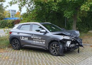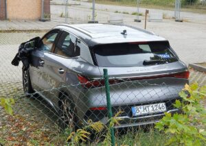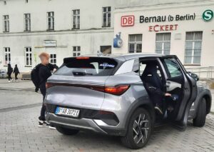 Gegenüber haben ein Hotel und ein ehemaliger Aldi-Markt je einen größeren Parkplatz, beide ebenfalls fast leer, eine Fülle an freien Parkplätzen, von denen Großstädter träumen. Auf einem hinteren, abgezäunten Teil des Ex-Aldi-Parkplatzes ist dann doch noch ein Mietwagen zu entdecken: ein grauer Elektro-Pkw der chinesischen Marke „Build Your Dreams“ (BYD) mit völlig demolierter Frontpartie, Uber-Türreklame, Barnimer Konzessionsnummer und Berliner Kfz-Kennzeichen.