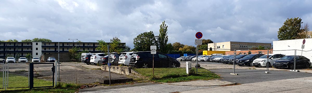 Das aus VEB-Zeiten übrig gebliebene Pförtnerhäuschen mit Schranke ist verlassen, ebenso der Flachbau, an dem das Firmenschild des Mietwagenunternehmens hängt. Niemand nimmt Aufträge an. Stehen denn Mietwagen auf dem Gelände? Ja, 29 Stück, allerdings auf einem umzäunten Teil des Parkplatzes und ausnahmslos ohne Nummernschild, überwiegend alles andere als neu aussehend. Die Wagen mit den Nummernschildern sind vermutlich alle gerade auf der Rückfahrt aus Berlin zum Betriebssitz, wird gescherzt.