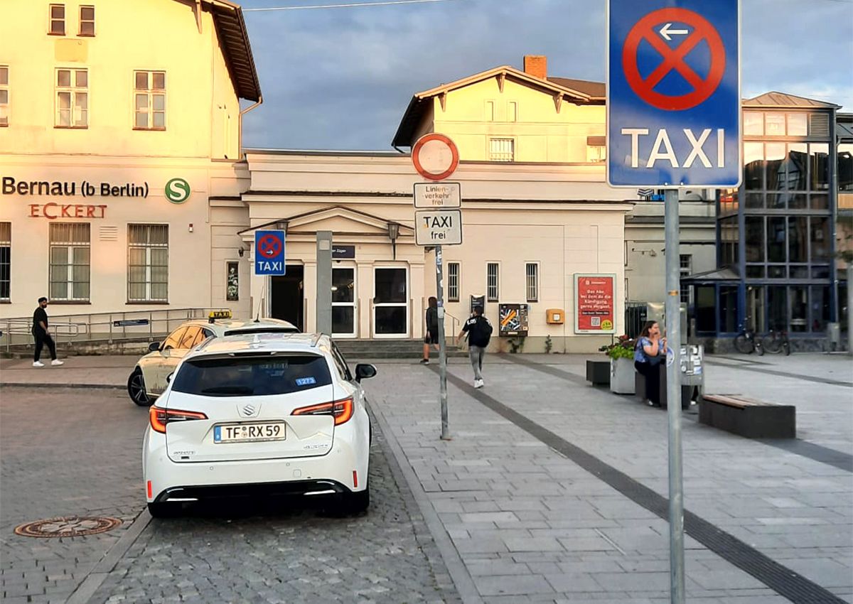 Der Landrat steht im persönlichen Kontakt zur Berliner Genehmigungs- und Aufsichtsbehörde, dem Landesamt für Bürger- und Ordnungsangelegenheiten (LABO). Diese „außerordentlich kollegiale Zusammenarbeit mit Berlin“ werde fortgesetzt. „Im Land Brandenburg wurde u. a. auch auf Anregung des Landkreises Barnim eine Arbeitsgruppe unter Leitung des Ministeriums für Infrastruktur und Landesplanung gebildet, welche am 22. September 2025 erstmalig tagte und sich mit den brandenburgweiten Entwicklungen auf dem Mietwagenmarkt und den Problemen im Bereich des Personenbeförderungsrechts auseinandersetzt.“ Das Taxigewerbe darf also vorsichtig Hoffnung schöpfen. Wie dringend nötig die Zusammenarbeit ist, zeigt ein von Bachmann dieses Jahr aufgenommenes Foto eines weißen Mietwagens aus dem Landkreis Teltow-Fläming (südlich von Berlin), der illegal auf dem Bahnhofsvorplatz von Bernau (nordöstlich von Berlin) hielt.