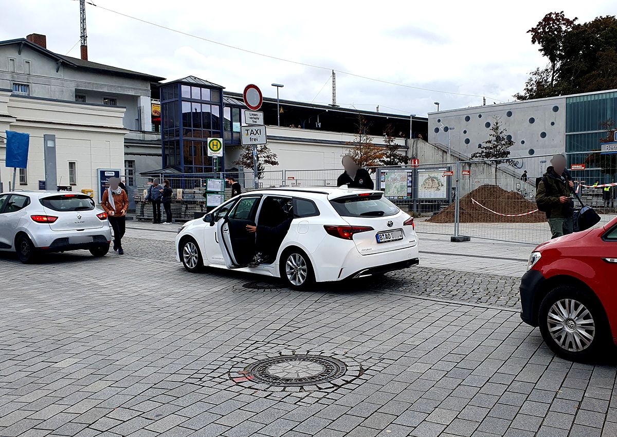 Seit auf dem Vorplatz des Bahnhofs gebaut wird und der reguläre Taxihalteplatz nicht nutzbar ist, wurden vom ohnehin schon knapp bemessenen kostenpflichtigen Parkhafen für Privatautos am 1. September noch drei Lücken als Taxihalteplatz und zwei für Behinderte abgezwackt. Zu interessieren scheint das niemanden. Als der Taxi-Times-Redakteur an einem Sonntagmittag im Oktober dort mit Bernd Bachmann zusammentrifft, ist alles von Privat-Autos zugeparkt. Aber die Fluktuation in der folgenden halben Stunde ist hoch. Alle paar Minuten verlassen ein, zwei Fahrer mit ihren Autos den Parkhafen und es kommen neue hinzu. Oft sind ein, zwei reguläre Lücken frei. Als man eine Autofahrerin, die auf dem Taxihalteplatz parkt, beim Aussteigen anspricht, warum sie das tut, obwohl eine legale Parklücke frei sei, blickt sie scheinbar überrascht auf die großen Schilder, steigt wortlos wieder ein und fährt durch den für Privat-Pkw verbotenen ÖPNV-Bereich des Bahnhofsvorplatzes davon, gefolgt von einem Uber-Mietwagen. Auch das sei gang und gäbe, erzählt Bachmann.