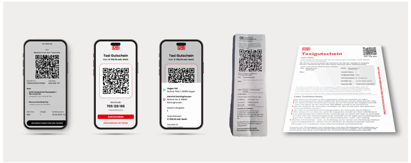 - Der QR-Code muss nicht eingelesen werden, für die Abrechnung reicht, entweder der Bahngutschein als Ausdruck oder alternativ ein Foto des Gutscheins aus, wenn er im Taxi auf einem Smartphone vorgelegt wird.