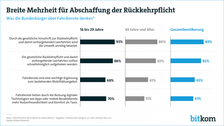 „Die Rückkehrpflicht im Personenbeförderungsgesetz ist völlig aus der Zeit gefallen und konterkariert aktuelle Anstrengungen der Politik für mehr Klimaschutz und weniger Verkehr. Das Leerfahrten-Gesetz ist ein Klima-Killer und dient heute nur noch dazu, das Taxi-Gewerbe vor unliebsamer Konkurrenz zu schützen“, lässt sich Bitkom-Präsident Achim Berg in einer Pressemeldung zum Ergebnis der Umfrage zitieren.