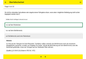 Die Beantwortung erfolgt im Multiple-Choice-Verfahren: Es werden jeweils drei Antworten angeboten, von denen eine, zwei oder alle drei richtig sein können, wobei meist eine Auswahl zu treffen ist, da die Antworten einander zum Teil widersprechen und somit Entweder-oder-Optionen darstellen. Ein Teil der falschen Antwortmöglichkeiten ist nicht leicht zu identifizieren, in anderen Fällen ist der Einfallsreichtum der Autoren amüsant, etwa wenn auf die Frage, was bei der Mitnahme von Tieren zu beachten ist, die Antwort angeboten wird, „dass das Fahrzeug nicht den Tiergeruch annimmt“, oder als mögliche Antwort auf die Frage, in welchen Fällen mit dem Taxi vom kürzesten Weg abgewichen werden darf, ein als abwechslungsreicher empfundener Weg zur Auswahl gestellt wird.