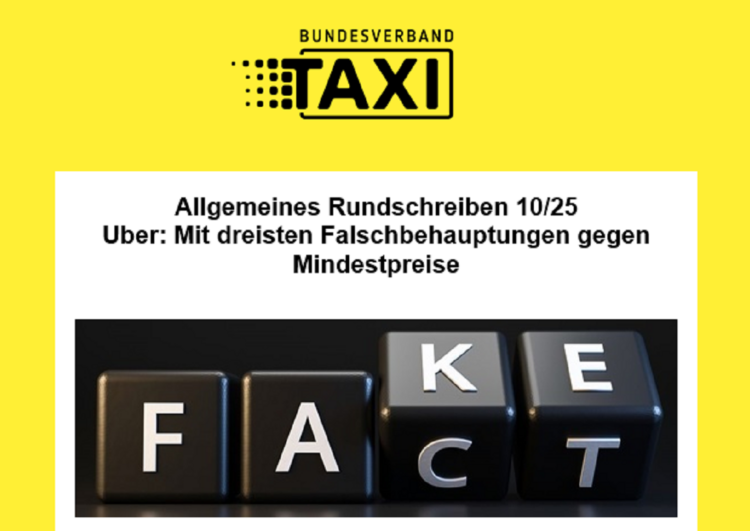 „Bei dieser Aussage handelt es sich um eine dreiste Falschbehauptung“, warnt der Bundesverband Taxi und Mietwagen e.V. (BVTM) in einem Rundschreiben an alle Mitglieder.