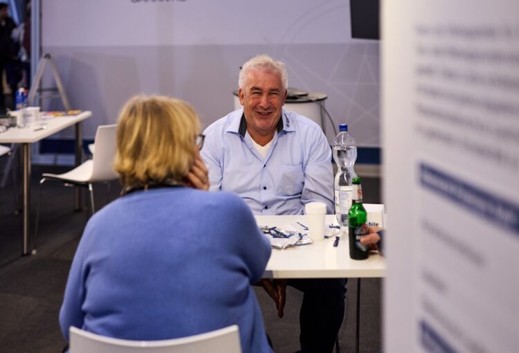 Das Beitragsfoto zeigt Rainer Dörr im Kundengespräch während der Europäischen Taximesse 2024. Dörr ist Firmengründer der Mobile Garantie Deutschland GmbH, die seit Aprl 2023 zu Helvetia-Versicherungen gehört. Foto: Taxi Times