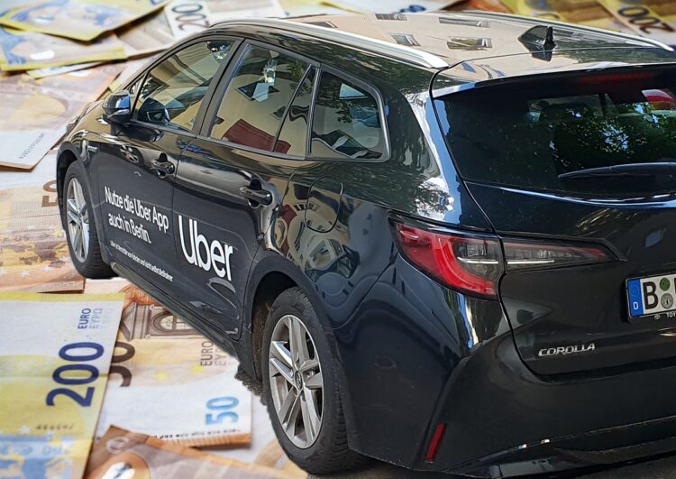 Beitragsfoto: Uber-Mietwagen (Foto: Axel Rühle) schwimmt im Geld (Foto: Pixabay/fotoblend)