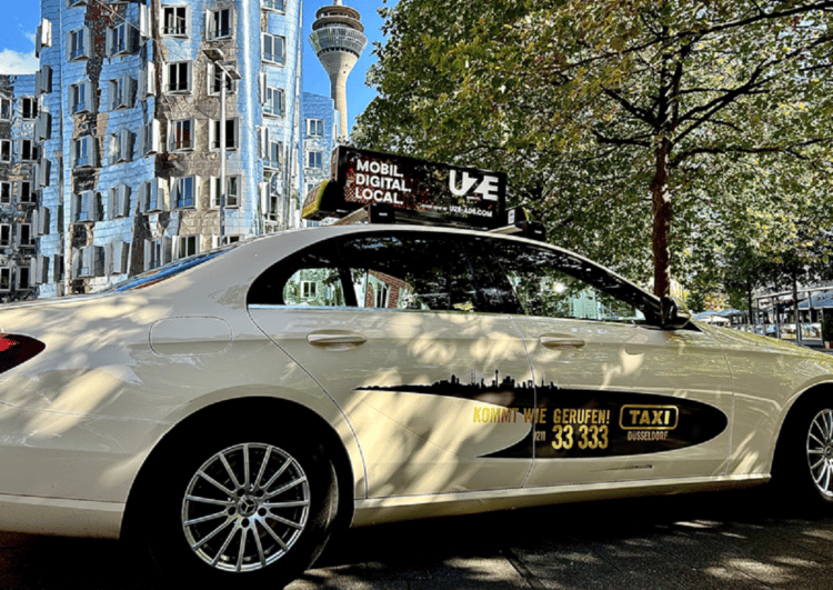 Seit rund einem Monat fahren durch Düsseldorf 60 Taxis mit Dachwerbung. Sie verfügen über eine Sensortechnik, so dass immer ein zum Ort oder zum Wetter passendes Motiv erscheint. Das sorgt für höhere Einnahmen, von denen auch die Taxiunternehmer profitieren.