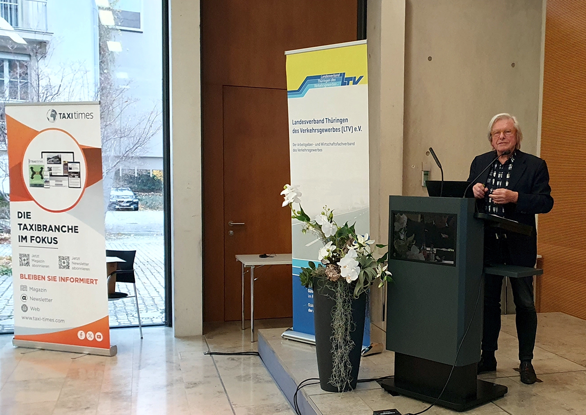 Gegen halb elf trat Taxi-Urgestein Herwig Kollar vor die Delegierten. Der Rechtsanwalt aus Frankfurt am Main war bis vor Kurzem Präsident des BVTM, bevor er das Amt am Mittwoch satzungsbedingt hatte abgeben müssen. Kollar begrüßte die Thüringer Kollegen und pries seinen gewählten Nachfolger Gregor Beiner („jünger und besser aussehend als ich“) launig als „waschechten Unternehmer“, der sich im BVTM wie Schwuchow ein weiteres Ehrenamt aufgeladen habe. Auch Schwuchow erhielt von Kollar einen Glückwunsch zu seiner Wahl in den BVTM-Vorstand.