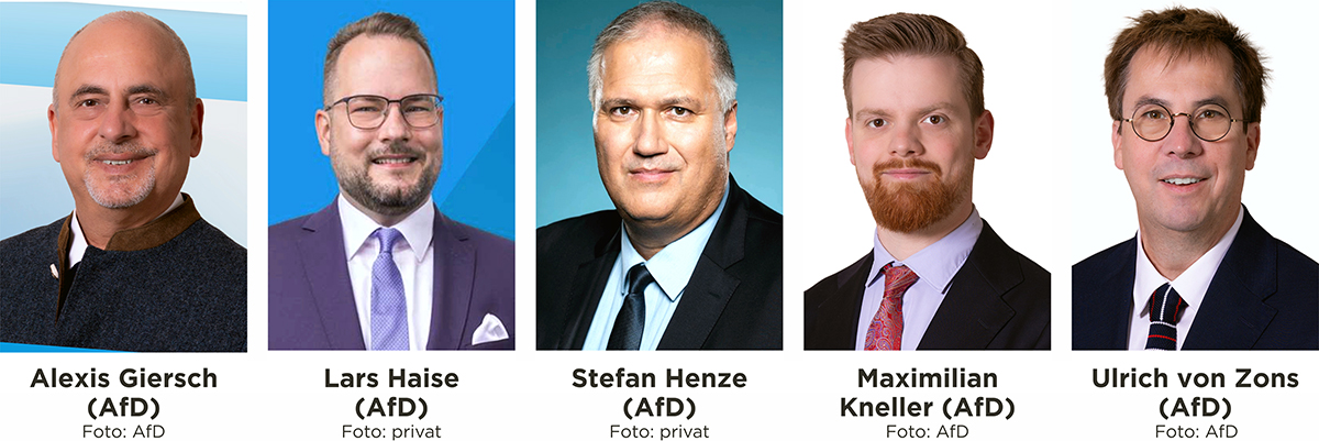 Auch von der AfD sind fünf Abgeordnete neu im Verkehrsausschuss: Alexis Giersch (*25.9.1963 in London) arbeitete sich über etliche Ausbildungen und Tätigkeiten (Elektroinstallateur, Nautischer Offizier) zum Maschinenbau-Ingenieur (FH) hoch und rückte 2025 über die Landesliste Schleswig-Holstein in den Bundestag nach. Lars Haise (*23.3.1989 in Schorndorf östlich von Stuttgart) ist gelernter Bürokaufmann. Von 2006 bis 2009 war er CDU-Mitglied und von 2009 bis 2018 in der Piratenpartei. 2018 begann er seine dritte Parteilaufbahn in der AfD, die ihn über mehrere Ämter auf Regional-, Kreis- und Landesebene 2025 über die Landesliste von Baden-Württemberg in den Bundestag führte. Stefan Henze (17.7.1965 in Hannover) ist studierter Finanz-/Bilanzbuchhalter IHK und war 2013 AfD-Politiker der ersten Stunde. 2025 kam er über die niedersächsische Landesliste in den Bundestag. Maximilian Kneller (*20.10.1993 in Bielefeld) ist Politik- und Literaturwissenschaftler. Im Gründungsjahr 2013 wurde er Mitglied der AfD und zog 2025 über die Landesliste Nordrhein-Westfalen in den Bundestag ein. Ulrich von Zons (*11.9.1968 in Wiedenbrück, heute Stadtteil von Rheda-Wiedenbrück bei Bielefeld) ist Jurist, arbeitete als Rechtsanwalt bei mehreren Banken und wurde 2019 Mitglied der AfD und kam 2025 über die Landesliste NRW in den Bundestag.
