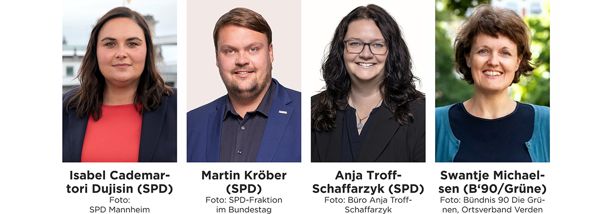 Von der SPD mit ihren 120 Sitzen sind drei Abgeordnete weiterhin im Verkehrsausschuss: Obfrau Isabel Cademartori Dujisin (*9.1.1988 im brandenburgischen Bad Saarow-Pieskow) wuchs in Santiago de Chile auf, wohin ihre Mutter mit dem chilenischen Vater mit der einjährigen Tochter nach dem Ende der Pinochet-Diktatur zog. Sie besuchte die private Deutsche Schule, bevor die Mutter im Jahr 2000 mit der 12-jährigen Isabel und deren Bruder nach Deutschland zurückkehrte und sich in Hannover niederließ. Die Doppelstaatlerin studierte in Mannheim Betriebswirtschaftslehre und kam 2012 in die Lokalpolitik, von wo aus sie sich über die baden-württembergische Landespolitik bis in den Bundestag hocharbeitete, in den sie 2021 direkt gewählt wurde. Martin Kröber (*2.12.1992 in Halberstadt im heutigen Landkreis Harz) übte bereits sehr unterschiedliche Tätigkeiten aus, arbeitete unter anderem in verschiedenen Gewerkschaften und ab 2009 in einem Bundestagsbüro, womit ein Jahr nach seinem SPD-Beitritt seine Parteilaufbahn begann. Später absolvierte er eine Ausbildung als Gewerkschaftssekretär und wurde 2021 direkt in den Bundestag gewählt, 2025 dann über die sachsen-anhaltinische Landesliste. Anja Troff-Schaffarzyk (* 1.10.1969 in Jemgum, Ostfriesland) absolvierte eine Ausbildung als Erzieherin in Münster und studierte Pädagogik in Oldenburg (Oldb). 2006 wurde sie SPD-Mitglied und zog 2021 über die niedersächsische Landesliste in den Bundestag ein.