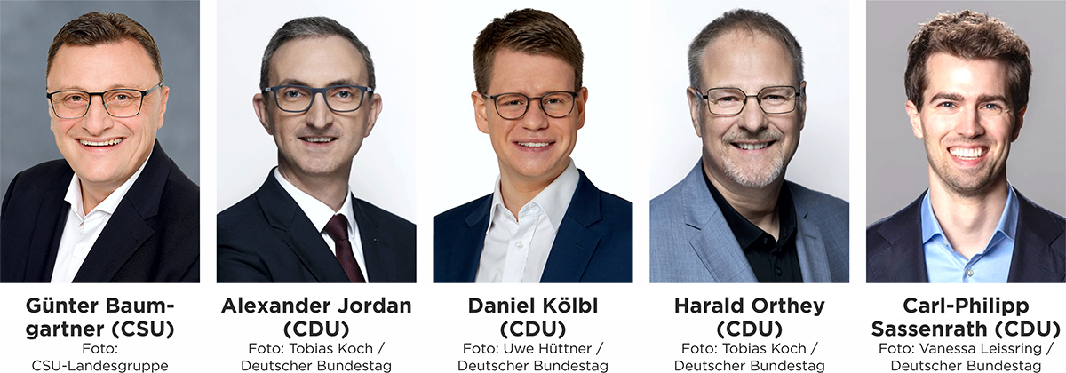 Neu im Verkehrsausschuss sind 18 Abgeordnete, darunter fünf aus der Unionsfraktion: Günter Baumgartner (*24.4.1975 in Rotthalmünster, Landkreis Passau) ist Bankkaufmann und seit 2000 in der CSU aktiv. Neben seinem Mandat übt er zwei Berufe aus: Vorstandsassistent bei der Sparkasse Rottal-Inn und Bürgermeister des Örtchens Bayerbach, wo die CSU eine gemeinsame Fraktion mit den Freien Wählern hat. Bei der Bundestagswahl 2025 gewann Baumgartner das Direktmandat des Landkreises Rottal-Inn (Platz 2: Stephan Protschka von der AfD, Platz 3: Hubert Aiwanger, Landes- und Bundesvorsitzender der Freien Wähler). Alexander Jordan (*21.11.1981 in Berlin) ist Diplomingenieur der Elektro- und Informationstechnik (FH) und trat 2001 in die Junge Union ein, lebt seit Längerem in Niedersachsen und sitzt für den Wahlkreis 051 Helmstedt – Wolfsburg im Parlament. Daniel Kölbl (* 29.10.1993 in Elmshorn nordwestlich von Hamburg) absolvierte eine Berufsausbildung als Bankkaufmann und zugleich ein Duales Studium in Business Administration, das er als Bachelor of Science abschloss. Der Banker ist seit 2012 CDU-Mitglied und gewann 2025 im Wahlkreis Pinneberg das Direktmandat für den Bundestag gegen Ralf Stegner. Harald Orthey (*25.6.1968 in Hachenburg im Westerwald) ist gelernter Großhandelskaufmann und seit den 1990er Jahren in der CDU aktiv. 2025 wurde er für den Wahlkreis Montabaur direkt in den Bundestag gewählt. Carl-Philipp Sassenrath (*26.2.1990 in Düsseldorfs Nachbarstadt Neuss) ist Jurist und seit 2008 in der CDU. 2025 wurde er für den Wahlkreis Neuss I direkt in den Bundestag gewählt.