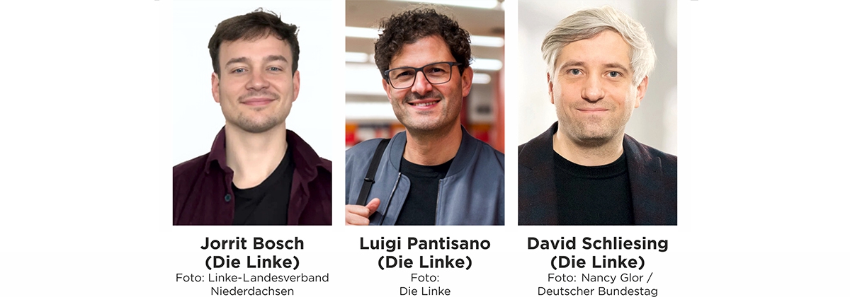 Aus der Fraktion Die Linke (64 Sitze) sind drei Abgeordnete neu im Verkehrsausschuss: Obmann Jorrit Bosch (*8.9.1997 in Lüneburg) studierte in Braunschweig Sozialwissenschaften und wurde 2019 Mitglied der Linken. 2025 kam er über die niedersächsische Landesliste in den Bundestag. Luigi Pantisano (*28.7.1979 in Waiblingen bei Stuttgart) lebte als Kind einige Jahre in der süditalienischen Heimat seiner Eltern und absolvierte nach seiner Ausbildung zum Bauzeichner ein Studium der Architektur in Stuttgart und Tokio und der Stadtplanung. 2017 trat er der Linkspartei bei und zog 2025 über die baden-württembergische Landesliste in den Bundestag ein. David Schliesing (*26.1.1983 in Osterburg (Altmark)) wuchs in Berlin auf und absolvierte ein Diplomstudium der Theaterregie, seiner beruflichen Haupttätigkeit. 2020 wurde er Mitglied der Linken und kam 2025 über die Landesliste von Sachsen-Anhalt in den Bundestag.