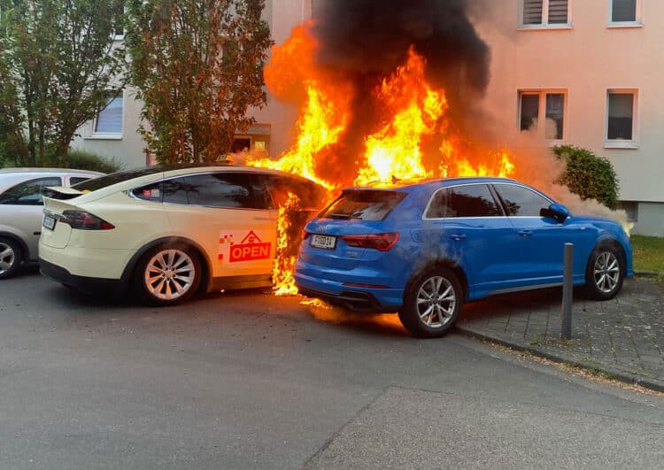 Zu diesem Zeitpunkt stand der Vorderwagen des Tesla Model X bereits lichterloh in Flammen. Bis zum Eintreffen der Feuerwehr war der Wagen und mindestens ein nebenan geparkter Audi bereits unwiderruflich zum Opfer der Flammen geworden. Um eine Brandstiftung hat es sich laut Polizei dabei nicht gehandelt. Die Ursache gilt bislang als unbekannt. Das Auto ist den Lesern der Taxi-Times wohlbekannt, hatten wir doch kurz nach der Inbetriebnahme des Model X-Taxi über den Wagen berichtet.