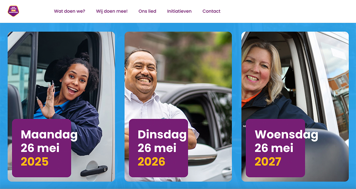 „Tausende von Taxifahrern und Taxifahrerinnen in den Niederlanden befördern ihre Fahrgäste täglich sicher und professionell an ihr Ziel. Für viele von ihnen sind diese Taxifahrer die unverzichtbare Verbindung zu Ausflügen, Betreuung, Schule, Freunden und Familie. Für Taxiunternehmer sind sie der wertvollste Teil des Unternehmens. Machen Sie Ihren Taxifahrern deshalb am Montag, dem 26. Mai, klar, wie unverzichtbar sie sind”, schlägt die Niederlande-weite Kampagne „Tag des Taxifahrers“ vor, eine Initiative sowohl für das Taxiunternehmen als auch für seine Kunden, gerade weil das niederländische Taxigewerbe etwa 80 Prozent ihres Umsatzes aus vielfältigen sozialen Beförderungsaufgaben holt.