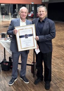 Eckhard Schmidt ist noch immer Funkteilnehmer – im November seit genau 50 Jahren. Aus diesem Anlass verlieh Hermann Waldner ihm am 23. November eine Dankesurkunde. „Ein besonderer Dank an Eckhardt Schmidt für 50 Jahre treue und erfolgreiche Zusammenarbeit“ heißt es darauf kurz und prägnant. Die Überreichung der Urkunde und eines 500-Euro-Gutscheins erfolgte in der Classic Remise in Berlin-Moabit, wo Waldner mit seinem treuesten Funkteilnehmer anschließend beim gemeinsamen Abendessen anlässlich des gleichzeitig stattfindenden 50-jährigen Betriebsjubiläums des Taxibetriebs Eckhard Schmidt über das Taxigewerbe und die Vermittlung im Wandel der Zeit philosophierte. ar