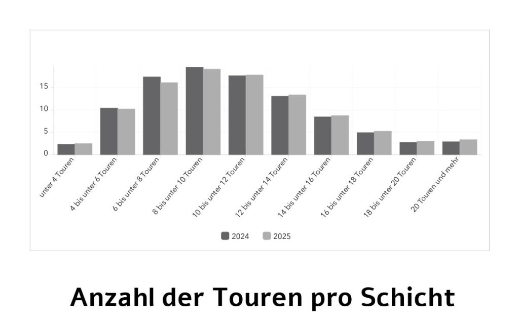 Diese Mehrfahrten wurden nicht durch den Einsatz mehrerer Taxis erreicht. Pro Fahrzeug wurden 2024 im Durchschnitt 3.209 Touren absolviert, 2025 waren es 3.352. Vor der Pandemie (2019) lag dieser Wert noch mit 3.599 Touren deutlich darüber. Auch die Touren pro Schicht blieben unter früheren Werten: 2024 wurden durchschnittlich 10,07 Fahrten je Schicht gezählt, 2025 waren es 10,24. 2017 lag der Wert noch bei knapp zwölf Touren.