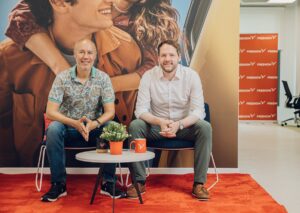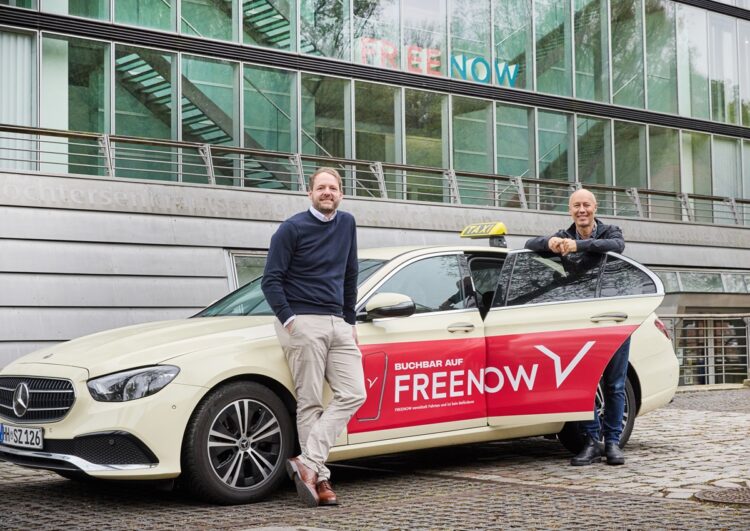 Beitragsbild: Free-Now-Geschäftsführer Thomas Zimmermann und Lyft-Geschäftsführer David Risher vor der Free-Now-Geschäftsstelle in Hamburg; Foto: Free Now