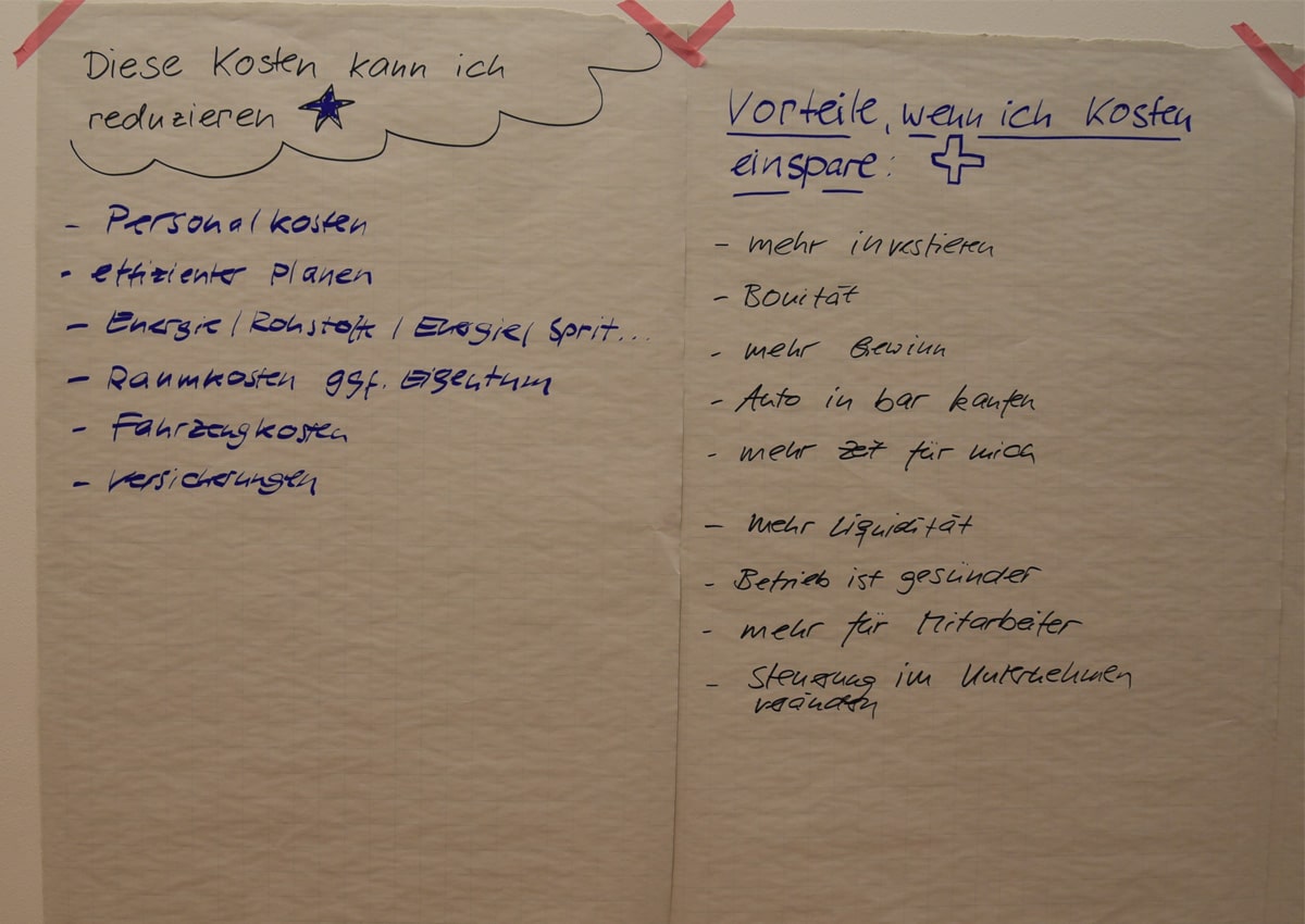 Gemeinsam mit der Gruppe wurden anschließend weitere Möglichkeiten der Kosteneinsparung erarbeitet – inklusive der Vorteile, die sich daraus und aus einer gesunden BWA ergeben: