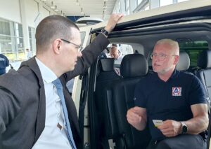 Zum Thema Inklusionstaxi wusste Stefan Willjes den Gästen Antwort auf alle Fragen zur Rollstuhlrampe und anderer Ausstattungsteile an seinem mitgebrachten Vito in der Langversion mit Heckausschnitt. Das Taxigewerbe sei für seine Firma ein wachsender Kundenkreis.