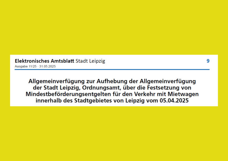 Der Text im Amtsblatt ist kurz und knapp: „Die Allgemeinverfügung der Stadt  Leipzig, Ordnungsamt, über die Festsetzung von Mindestbeförderungsentgelten für den Verkehr mit Mietwagen innerhalb des Stadtgebietes von Leipzig vom 21.03.2025, welche im Wege der Bekanntmachung am 05.04.2025 im Elektronischen Amtsblatt veröffentlicht  wurde, wird mit vollständiger Wirkung für die Vergangenheit zurückgenommen.“