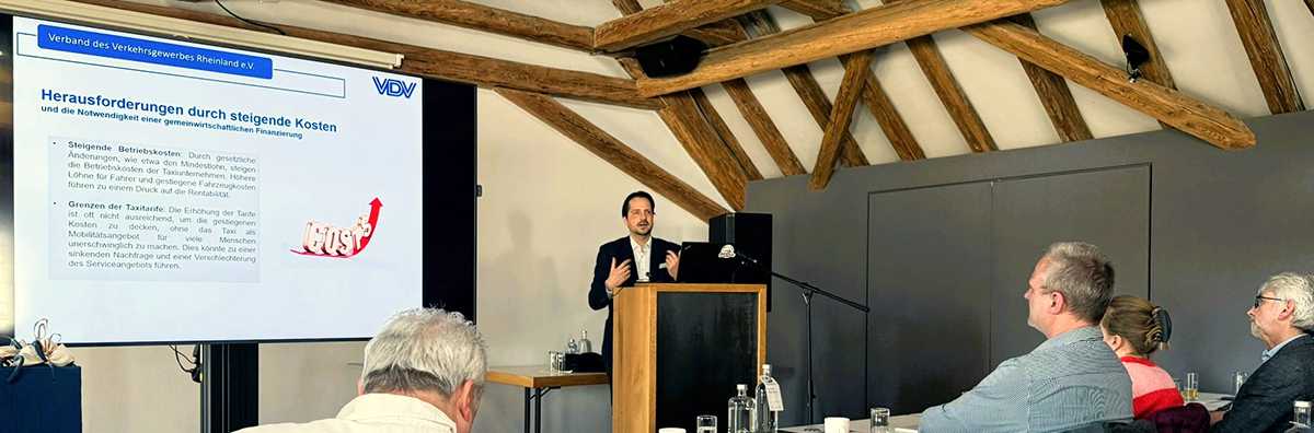 Ein zentrales Thema der Versammlung war die Rolle von Taxi- und Mietwagenunternehmen als Teil des öffentlichen Personennahverkehrs. Guido Borning, Geschäftsführer des VDV Rheinland und von MOLO, betonte in seinem Vortrag, dass die Taxibetriebe eine essenzielle Ergänzung zu Bus und Bahn darstellen – gerade in ländlichen Regionen oder zu Randzeiten. Durch ihre stärkere Einbindung in digitale ÖPNV-Strukturen ließen sich nicht nur Mobilitätslücken schließen, sondern auch neue wirtschaftliche Perspektiven für die Unternehmen schaffen.