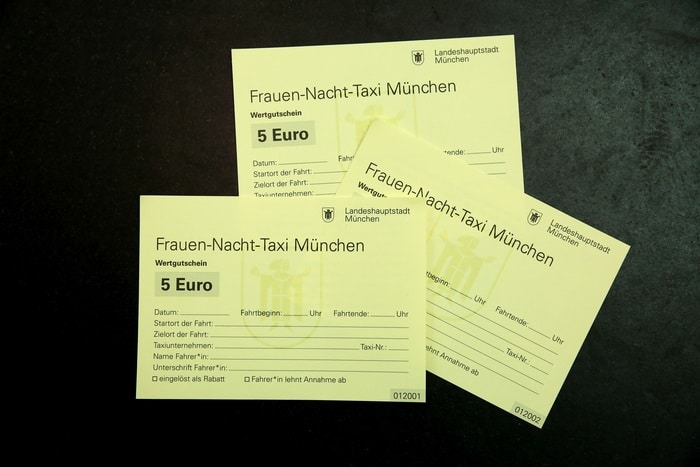 Das Münchner Frauen-Nacht-Taxi (FNT), für das die Stadt eine eigene Homepage errichtet hat (frauennachttaxi-muenchen.de) sieht einen Zuschuss über 5 Euro pro Fahrt in Form eines Gutscheins vor. Es können völlig anonym drei Gutscheine pro Besuch bei vielen Dienststellen der Stadt abgeholt werden. Auch durch auswärtige Frauen und Touristinnen. Auf Nachfrage hat das Kreisverwaltungsreferat bestätigt, dass die Ausgabe der Gutscheine nach dem offiziellen Ende unterbrochen worden war, aber zwischenzeitlich wieder aufgenommen wurde. Im kommenden Herbst wird sich der Stadtrat erneut mit dem FNT befassen.