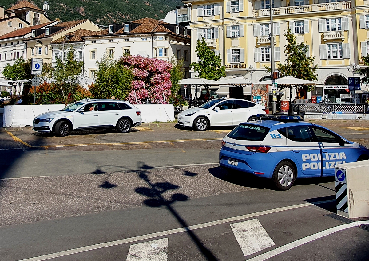 Taxis und Polizeiwagen in Bozen Foto Axel Rühle