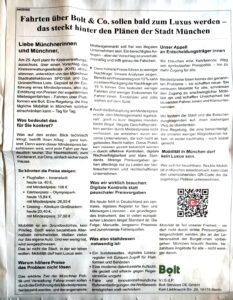 Als Reaktion auf eine große Werbeaktion des Fahrdienstes Bolt in Münchner Tageszeitungen und auf Plakatwänden, mit denen Stimmumg gegen die geplanten Mindestbeförderungsentgelte für Mietwagen gemacht wird, hat Taxi Times einen Offenen Brief an die Bevölkerung verfasst: