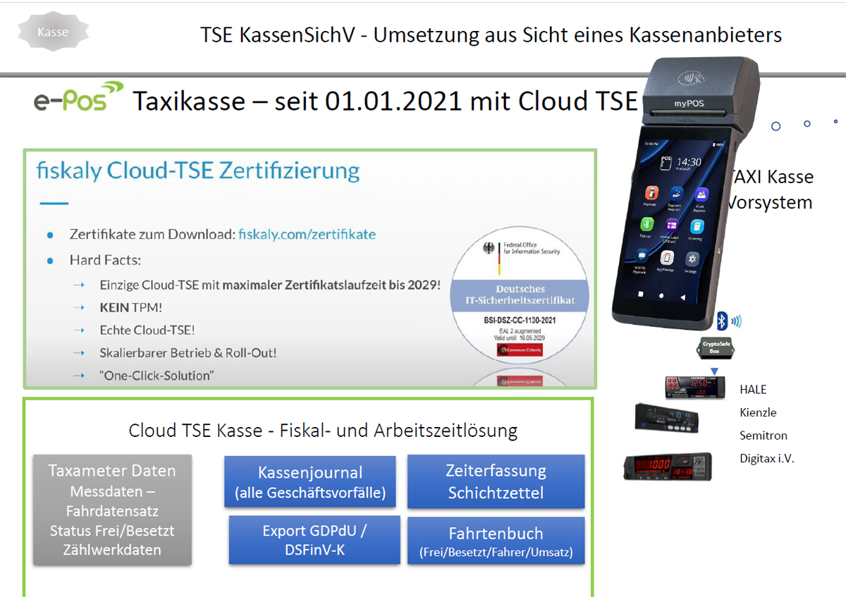 Gesichert würden die Daten über eine Fiskaly-Cloud-TSE. Durch die Anbindung einer Bluetooth-Box an die offene Fahrdatensatzschnittstelle sei so auch kein Eichtermin erforderlich. Im Ergebnis kann die von Payco vertriebene myPos-All-in-One Lösung nach Einschätzung von Schröder so allen Ansprüchen der KassenSichVO genügen und ist beispielweise mit dem aktuellen F2-Taxameter von Digitax eine kostengünstige Lösung für die kommende TSE-Pflicht. Das System werde aber auch mit den Taxametern anderer Hersteller arbeiten, wenn diese ihm die entsprechenden Datenschnittstellen öffnen. rw