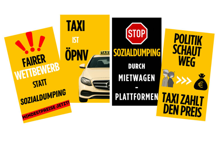 Das Beitragsfoto zeigt die Protestplakate, die bei der heutigen Taxidemo zum Einsatz kommen werden. Fotos: Taxi München eG, Collage; Taxi Times