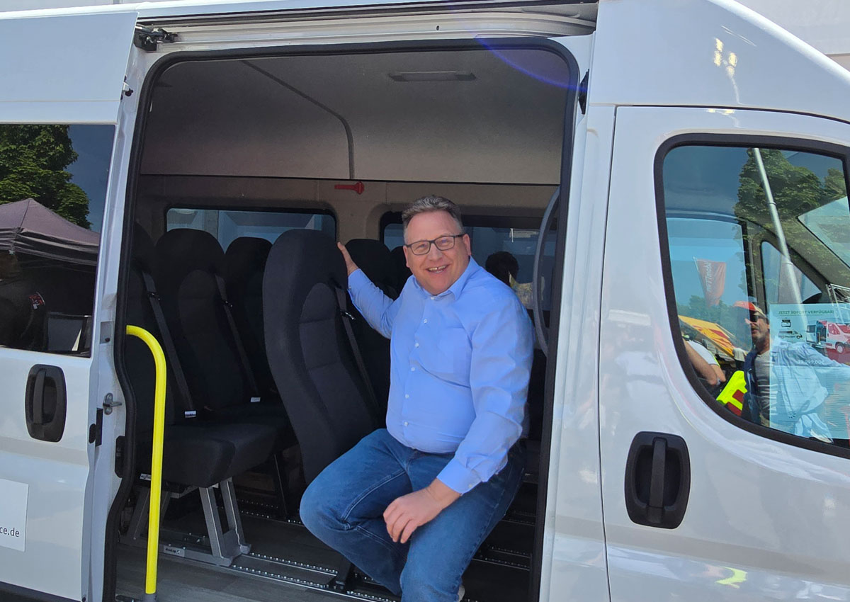 Ein ähnliches Angebot, wenn auch mit einer deutlichen Nähe zu den Fahrzeugen des Stellantis-Konzerns (Citroën + Peugeot), gab es bei Activa aus Borken zu sehen. Neben einem Peugeot Rifter mit Heckausschnitt war am Messstand noch ein weiterer, frisch entwickelter Franzose, ein Renault Kangoo, mit Heckausschnitt ausgestellt. Er kann vor allem auch wegen seiner großzügigen Kopffreiheit punkten. Wie Olaf Benning, Geschäftsführer bei Activa betonte, habe man sich auf die anstehende hohe Nachfrage vorbereitet, sobald beispielsweise nach einer gewonnenen Schülerfahrten-Ausschreibung der Bedarf an schnell lieferbaren Neun-Sitzer-Transportern besteht. Mit solchen Anfragen sei im Sommer zu rechnen, wenn die Ausschreibungen für die Schülerverkehre abgeschlossen sind. Speziell für diesen Einsatz hatte Benning auch ein Aktionsangebot mitgebracht. Der Fiat Ducato L2H2 wird als Neunsitzer, inklusive Rollstuhlplatz, ab 39.990 Euro (netto) angeboten. Der Wagen ist mit einer Zusatzheizung und einer erweiterten Klimaanlage für den Fahrgastraum ausgestattet. Nicht inklusive ist hingegen ein Lift beziehungsweise eine Rampe für den Rollstuhl. Umgerüstet werden die Fahrzeuge übrigens mit Komponenten von der Firma api. Dass sich die beiden Unternehmen sehr nahe stehen, zeigte auch die Tatsache, dass man sich in Fulda wie auch schon bei der Kölner Taximesse einen Messestand teilte.