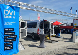 So auch im Außenbereich am großen Stand von DVI Mobile. Das Unternehmen aus Viersen zeigte unter anderem ein KMP-Fahrzeug und einen Ford Tourneo Connect mit Heckausschnitt. DVI Mobile rüstet derzeit mehr als 500 Fahrzeuge im Jahr um. Es stehen Fahrzeuge zum sofortigen Verkauf zur Verfügung. Das Volumen soll aber noch weiter ausgebaut werden. Möglich wird das beispielsweise durch einen anstehenden großzügigen Neubau.