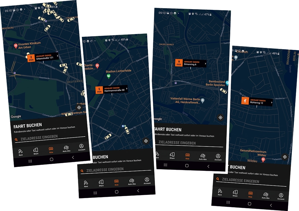 Zum Vergleich Sixt: So sehen ehrliche Angaben aus; mal 3 min, mal 5 min, mal 9 min Anfahrtszeit des nächsten Taxis, und im Ausnahmefall ist auch mal gar keins in der Nähe (winkende Figur). Screenshots: Sixt-App