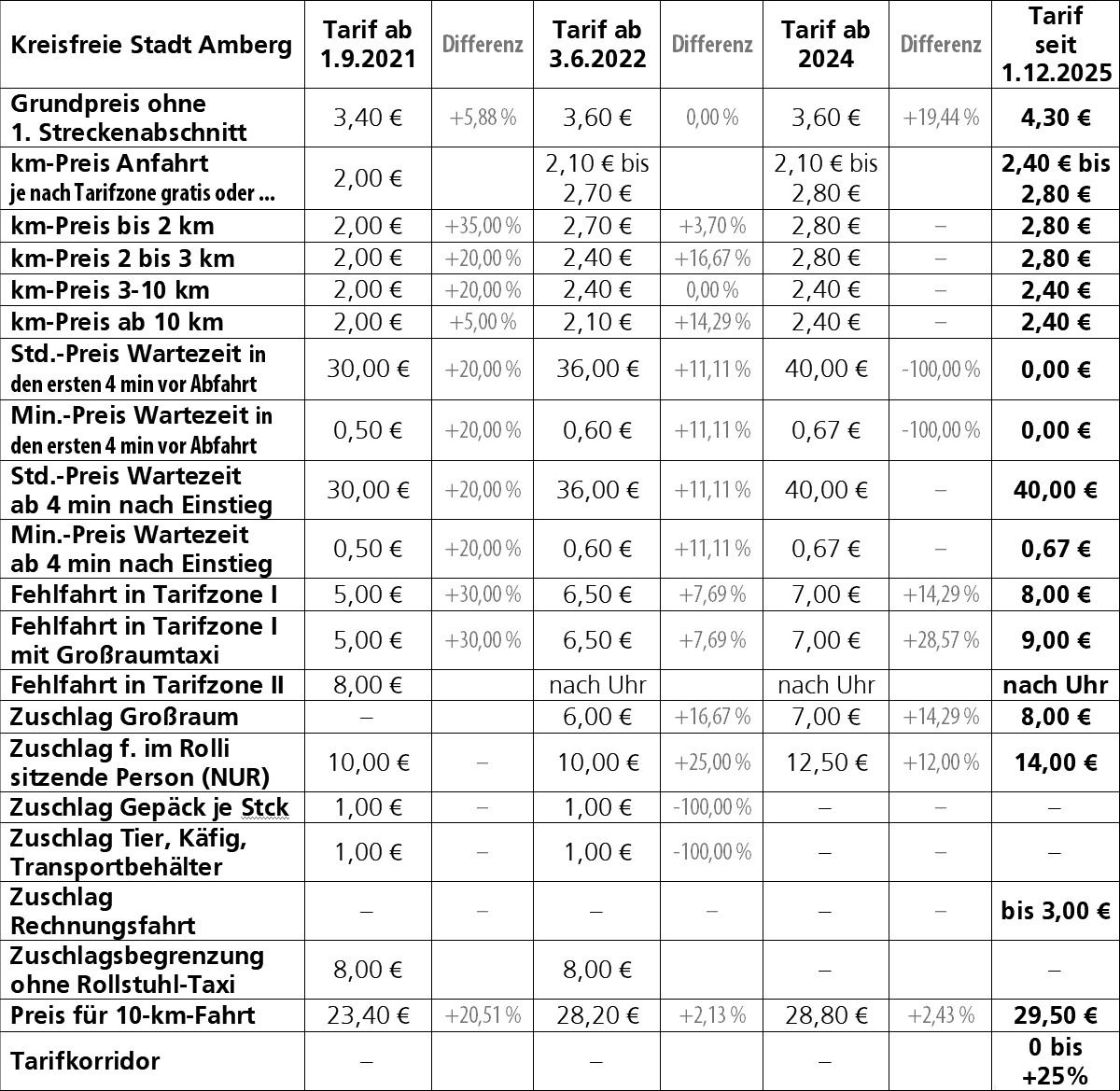Der Tarif der kreisfreien Stadt Amberg hat dagegen einige Besonderheiten, die mit den letzten drei Tarifanpassungen zum Teil wechselten. So gab es im Tarif vom September 2021 noch keine Degression: Zum Grundpreis von 3,40 Euro kam ein Kilometerpreis von 2,00 Euro, unabhängig von der Streckenlänge, wobei mindestens die ersten 100 Meter bezahlt werden mussten. Die Warteminute kostete 50 Cent, eine Fehlfahrt im Kernbereich (Tarifzone I) 5 Euro und im äußeren Bereich (Tarifzone II) 8 Euro. Zuschläge wurden erhoben für Rollitaxis (NUR, nicht-umsetzbarer Rollstuhl) (10 Euro), Gepäck (1 Euro pro Stück) und Tiere (mit oder ohne Käfig 1 Euro).