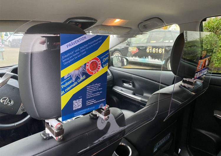 In Zusammenarbeit mit dem Polizeipräsidium Karlsruhe informiert Taxi-Holl im Fahrzeug über Enkeltrick-Betrug.