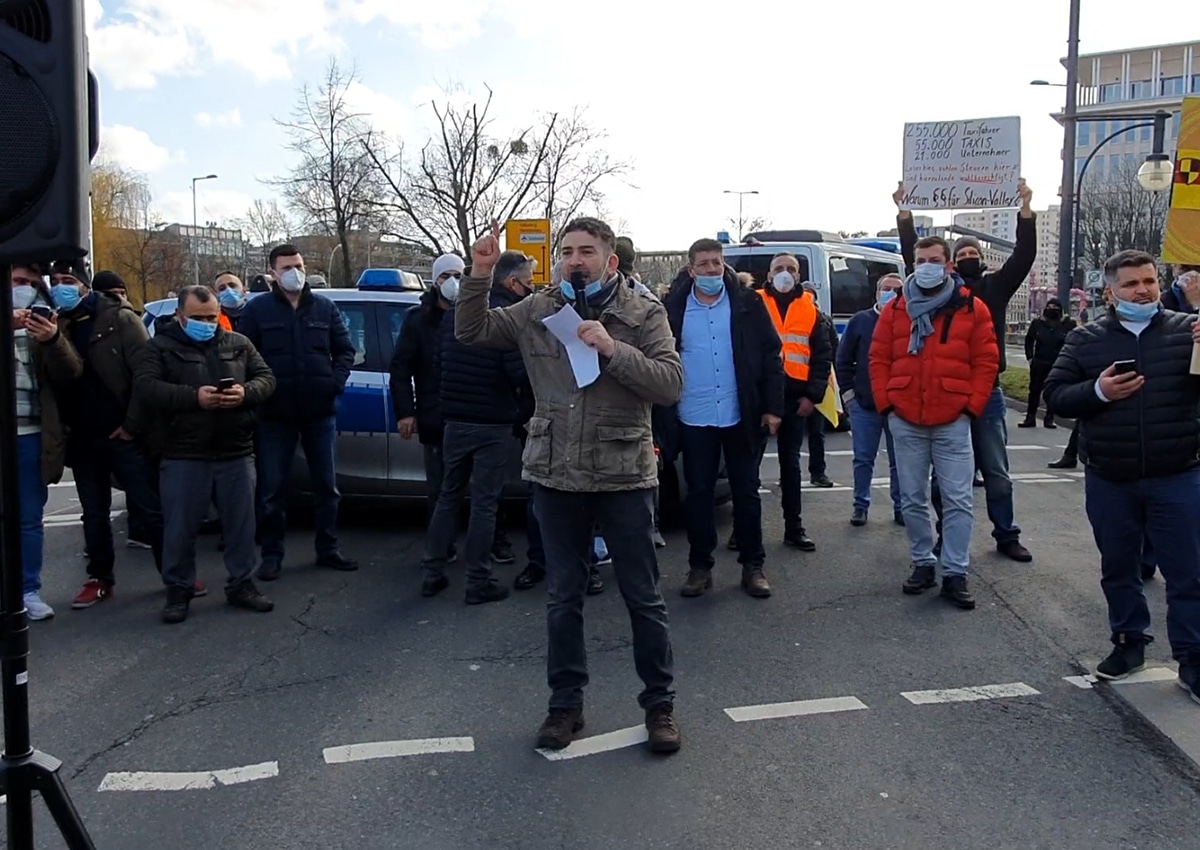 Murat K... redet bei der Taxi-Demo in Berlin am 19.2.2021 (Foto Axel Rühle)
