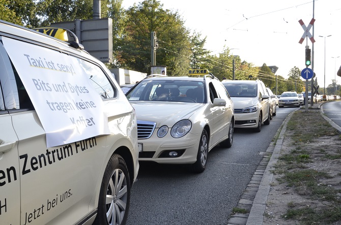 Zeitlich versetzt zur Taxidemo in München hatten der Landesverband Bayerischer Taxi- und Mietwagenunternehmer als Schirmherr und die Nürnberger und Erlanger Taxizentrale eine Taxidemonstration für die Abendstunden organisiert. Ohne vorherige Sternfahrt versammelten sich die Unternehmer in einer von der Polizei abgesperrten viel befahrenen Straße. Rund 300 Taxiunternehmer und Fahrer aus Nürnberg, Erlangen, Fürth und anderen fränkischen Städten und Gemeinden waren erschienen. Selbst Kolleginnen und Kollegen aus Berlin waren mit vier Taxis angereist und auch der eine oder andere Taxifahrer aus München hatte sich nach der eigenen Demo auch noch auf den Weg nach Nürnberg gemacht. Sie alle wurden von Wolfgang Ziegler, Vorstandsmitglied der Taxizentrale Nürnberg sowie des Landesverbands Bayern begrüßt.