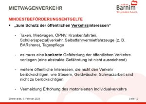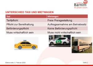 Im Zuge der Präsentation sprach die Amtsleiterin über Antragsvoraussetzungen nach Paragraph 13 PBefG in Verbindung mit der Berufszugangsverordnung für den Straßenpersonenverkehr (wobei sie zum Ergebnis kam, dass die gesetzlichen Voraussetzungen zu gering sind), und beschrieb Konflikte und Herausforderungen im Taxi- und Mietwagenverkehr.