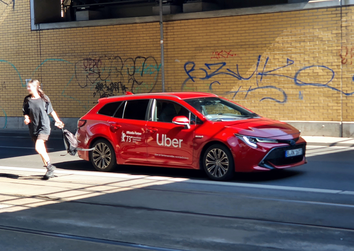 Frau rennt von rotem Uber-Mietwagen weg Foto Axel Rühle