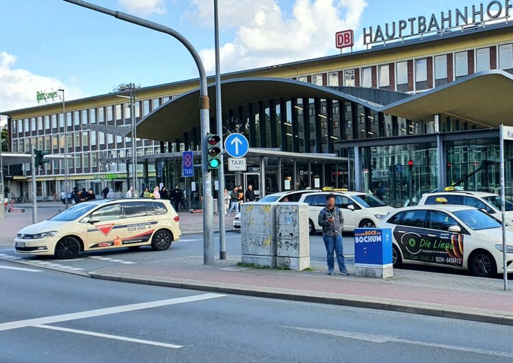 Beitragsfoto: Ein Fahrgast wartet am Bochumer Hauptbahnhof lieber auf ein auswärtiges Uber-Fahrzeug als in das nebenstehende Taxi zu steigen. Foto: Axel Rühle