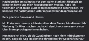 Der jährliche Bundespresseball „schmückt“ sich noch immer mit Uber als einem der Hauptsponsoren. Der Ball hat eine über 70-jährige Tradition und findet seit 1999 in Berlin statt. Am 4. April 2025 fand der 72. Bundespresseballzum wiederholten mal im Hotel Adlon in Nachbarschaft zum Brandenburger Tor statt. Der Pariser Platz, eine der prominentesten Adressen Deutschlands, wird aus diesem Anlass regelmäßig für den Individualverkehr gesperrt. Der Bereich vor dem Haupteingang des berühmten Nobelhotels, ein fester, beschilderter Taxihalteplatz, ist dann exklusiv den von Uber vermittelten Mietwagen vorbehalten. Für Taxis heißt es: Wir müssen leider draußen bleiben.