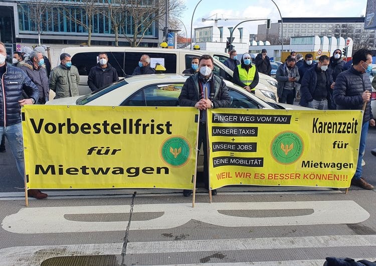 Das Beitragsfoto zeigt Berliner Taxis während einer Demo im Februar 2021. Foto: Axel Rühle