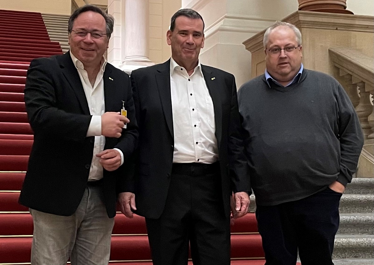 Foto TMV-Präsident Thomas Kroker und TMV-Hauptgeschäftsführer Patrick Meinhardt mit dem dem neuen Büroleiter Nico Höttges