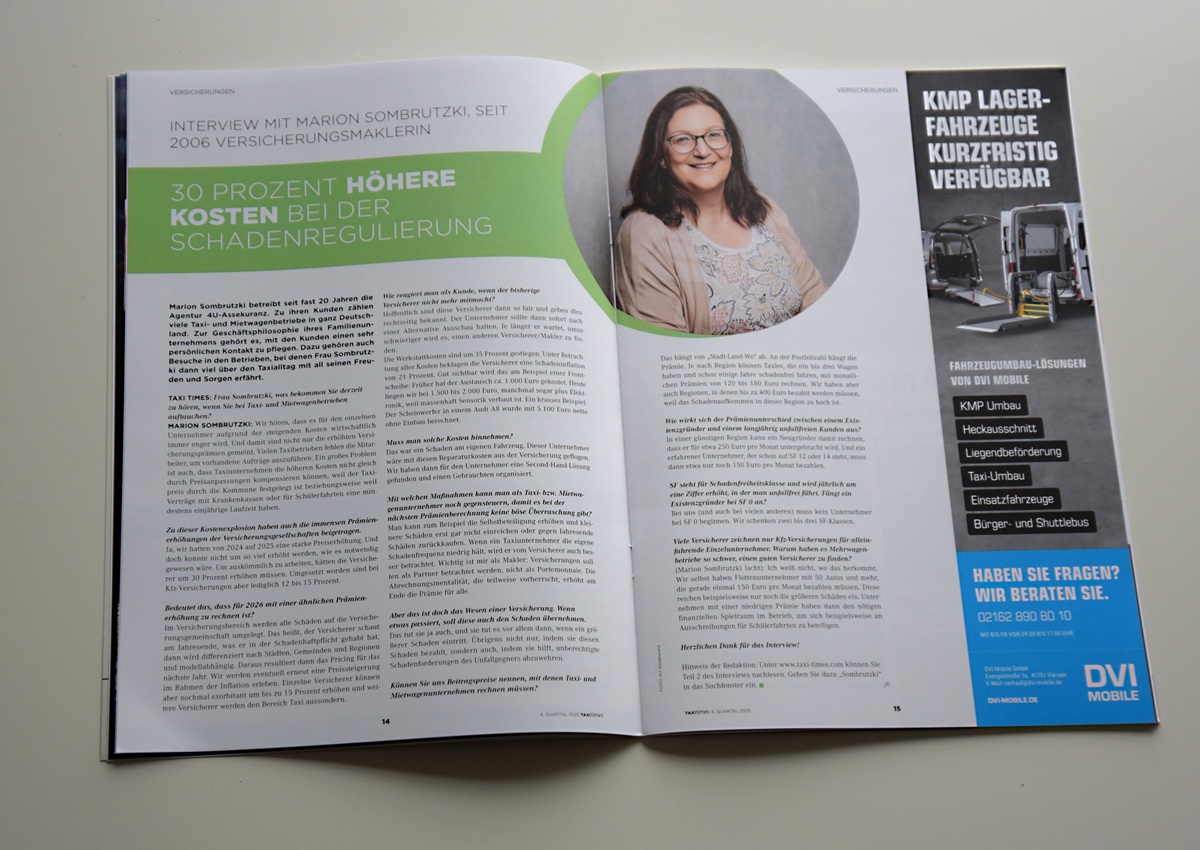 Lesen Sie im Teil 2 des Interviews, warum es für Taxibetriebe aufgrund steigender Kosten immer enger wird und welche Rolle die Prämienerhöhungen der Versicherer spielen. Frau Sombrutzki erläutert außerdem, warum die Kfz-Prämien letztes Jahr so immens gestiegen sind und gibt für 2026 eine Prognose ab. Zudem widerspricht Frau Sombrutzki der weitläufigen Ansicht, dass es Mehrwagenbetriebe schwerer haben, einen guten Versicherer zu finden.