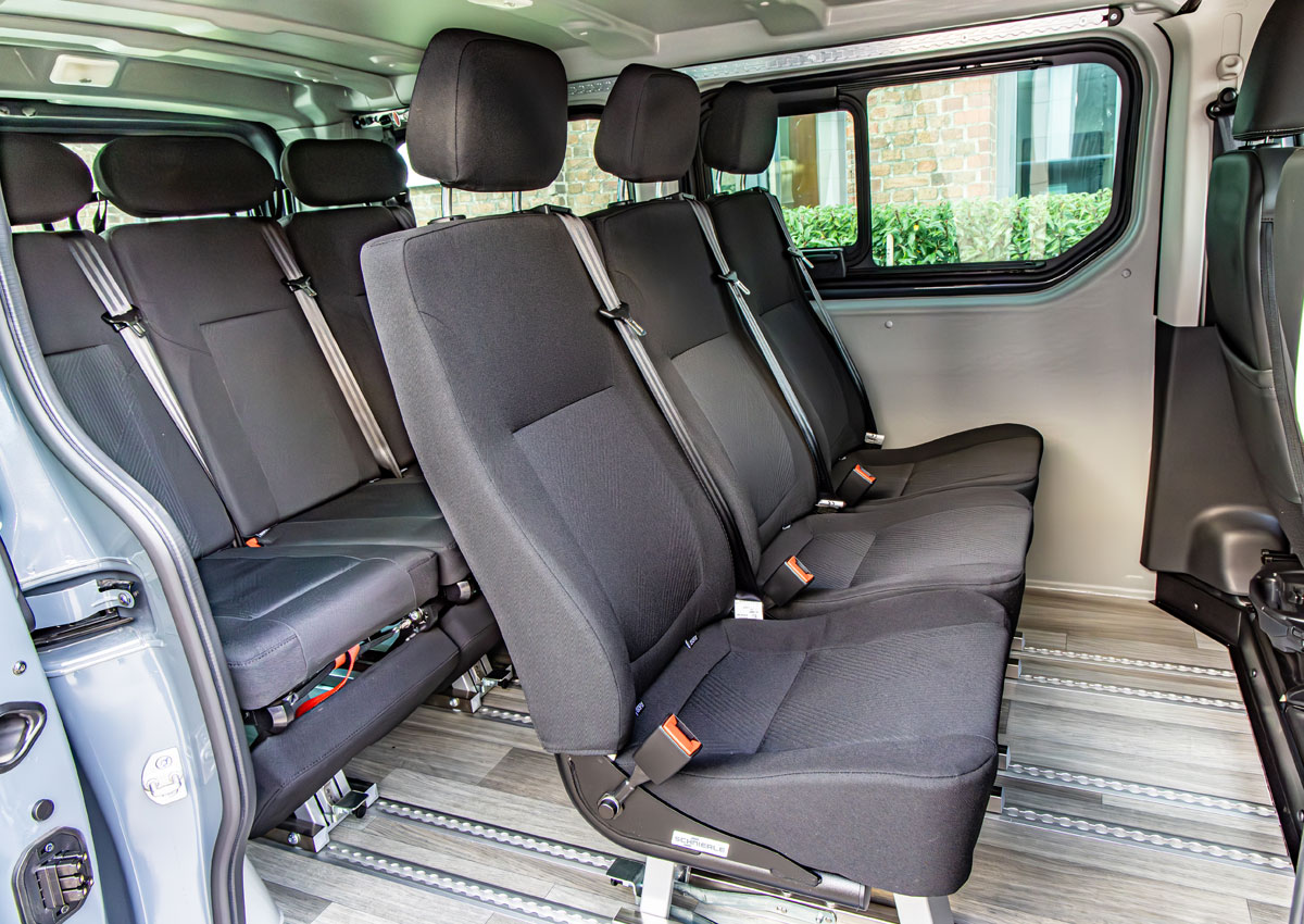 Die Basis bildet ein Schienensystem im Fahrzeugboden, über das sich die Einzelsitze in der zweiten und dritten Reihe frei positionieren oder entnehmen lassen. Dadurch kann der FlexVan je nach Bedarf als Zwei- bis Achtsitzer eingesetzt werden. Für den professionellen Personentransport stehen die „Flexus2“-Sitze zur Verfügung, die vor allem auf Alltagstauglichkeit und Robustheit ausgelegt sind – etwa im Taxi oder in der Schülerbeförderung.