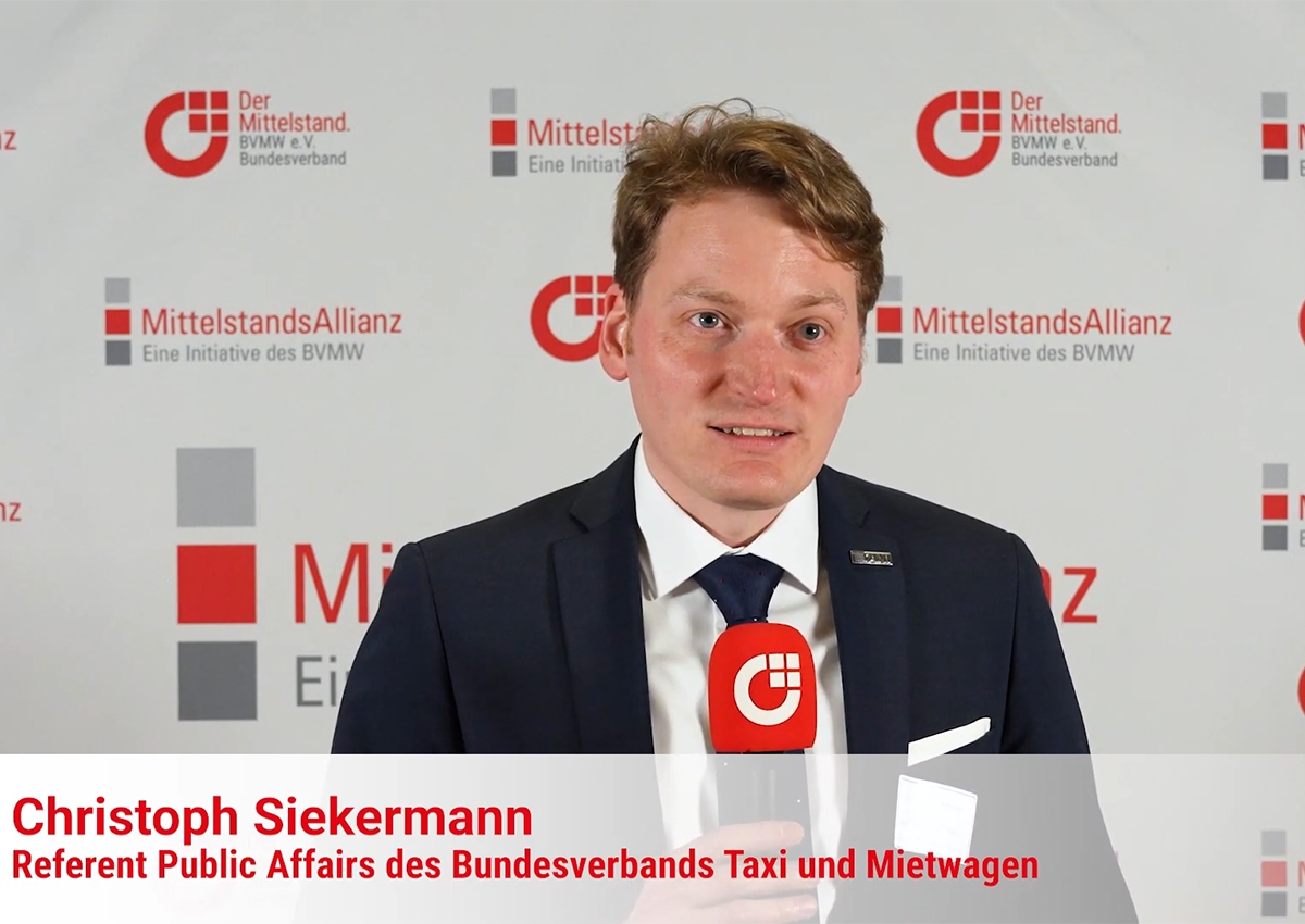 Zu den Teilnehmern der Jubiläumsfeier zählte auch Christoph Siekermann, Referent Public Affairs des Bundesverbandes Taxi und Mietwagen e. V. (BVTM), dessen Statement auf der Internetseite des BVMW gleich nach dem des Bundeskanzlers folgt. In seiner Grußbotschaft macht Siekermann nicht nur auf die Problemlagen im Taxigewerbe aufmerksam und weist auf die Notwendigkeit klarer und anwendbarer gesetzlicher Regelungen hin, sondern betont auch, wie wichtig es für den BVTM als Dachverband ist, Teil der Mittelstandsallianz und somit politisch vernetzt zu sein, um die Forderungen für das Gewerbe durchzusetzen.