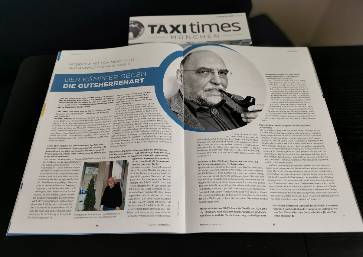 Der Kämpfer gegen die Gutsherrenart: München verliert seinen bekanntesten Taxi-Anwalt. Rechtsanwalt Michael Bauer wird in diesem Jahr deutlich kürzer treten. Seine Kanzleiräume sind bereits leer. Für Taxi Times blickt er noch einmal zurück auf juristische Meilensteine und äußert sich zur Zukunft des Taxigewerbes.
