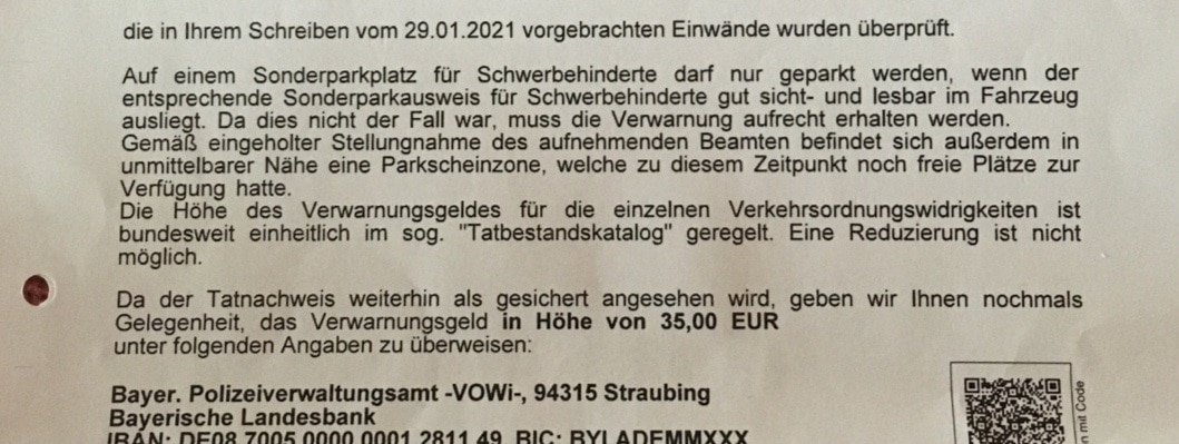 Der daraufhin eingelegte Einspruch mit ausführlicher Begründung wurde ganz formal zurückgewiesen. Es hat nichts genützt, dass der Schwerbehindertenausweis des von Geburt an blinden und schwerst gehbehinderten Fahrgastes in Kopie beigefügt war.