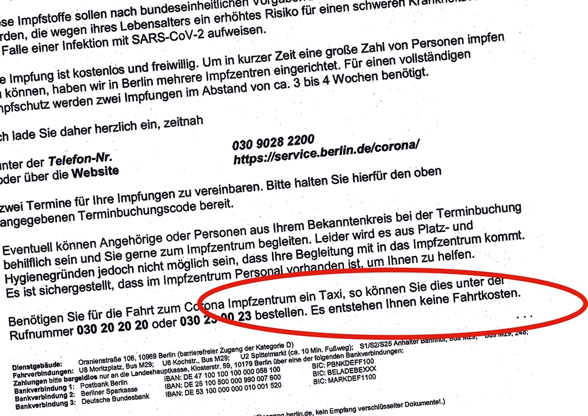 Als wichtige aktuelle Information gibt Taxi Berlin den Hinweis des DRK weiter, dass jede(r) Fahrer(in) vor Fahrtbeginn überprüfen muss, ob ihr Fahrgast tatsächlich Anspruch auf die kostenlose Hin- und Rückfahrt mit dem Taxi hat. Das sei nur bei Personen ab 70 Jahren der Fall. Geimpft werden inzwischen aber auch Personen von 60 bis 69, und diese müssen die Fahrt selbst bezahlen. Ließen sie sich aus Unwissenheit per Coupon fahren, so erstatte das DRK den Fahrpreis nicht.